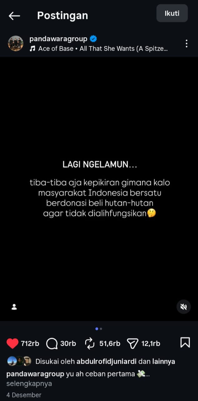 “Masalahnya bukan pada kemampuan publik membeli hutan, melainkan pada hilangnya kepercayaan terhadap negara sebagai pengelola sumber daya alam,” ujarnya, dikutip dari Kompas.id, 16 Desember 2025.